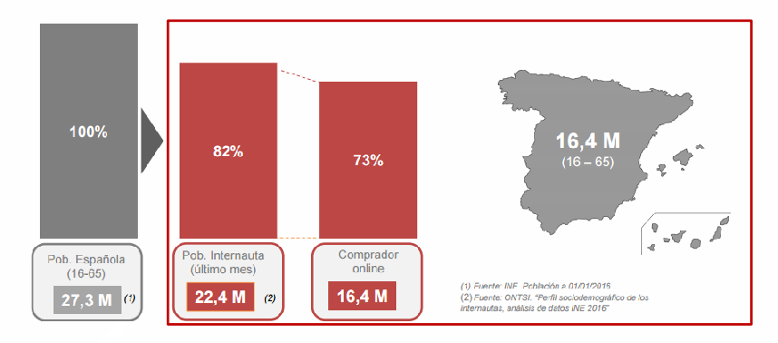 Para la realización del estudio, se han realizado 1010 entrevistas durante el mes de mayo 2017, a 737 individuos residentes en España, de 16 a 65 años de edad y compradores online, y a 273 no compradores online.