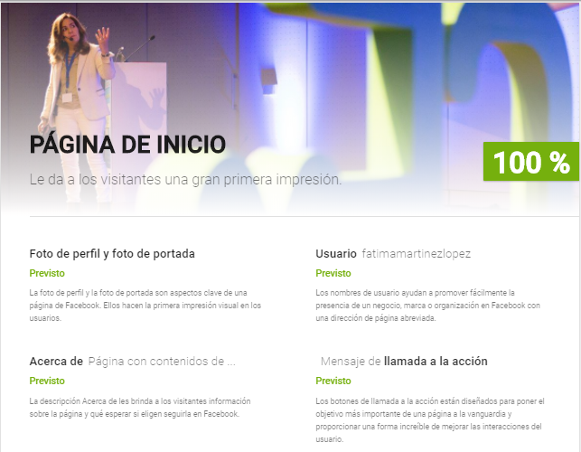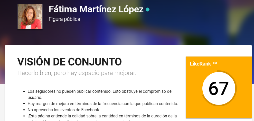 Además nos evalúa la foto de perfil y foto de portada, el contenido y puntúa la actividad de la página en publicaciones, eventos, longitud de las publicaciones, páginas que le gustan a la página y vídeo nativos en Facebook.