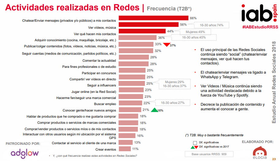 - La mayoría de los usuarios utilizan las redes sociales para chatear, enviar mensajes y ver vídeos o escuchar música.