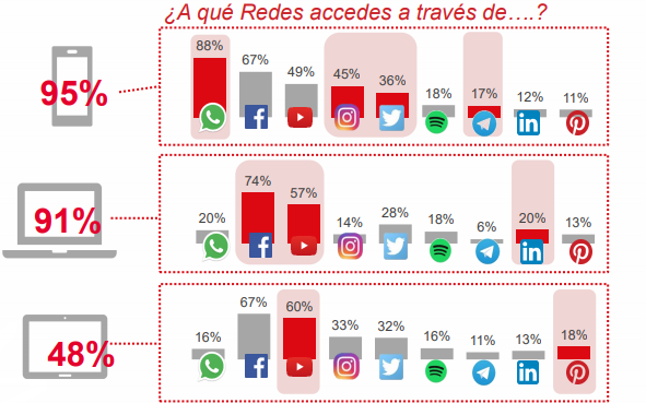 - El móvil es el dispositivo más utilizado para conectarse a redes sociales, excepto para Facebook y Linkedin que es el ordenador