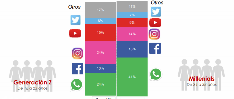 - La Generación Z es la que más redes sociales utiliza, especialmente Instagram, WhatsApp y Youtube.