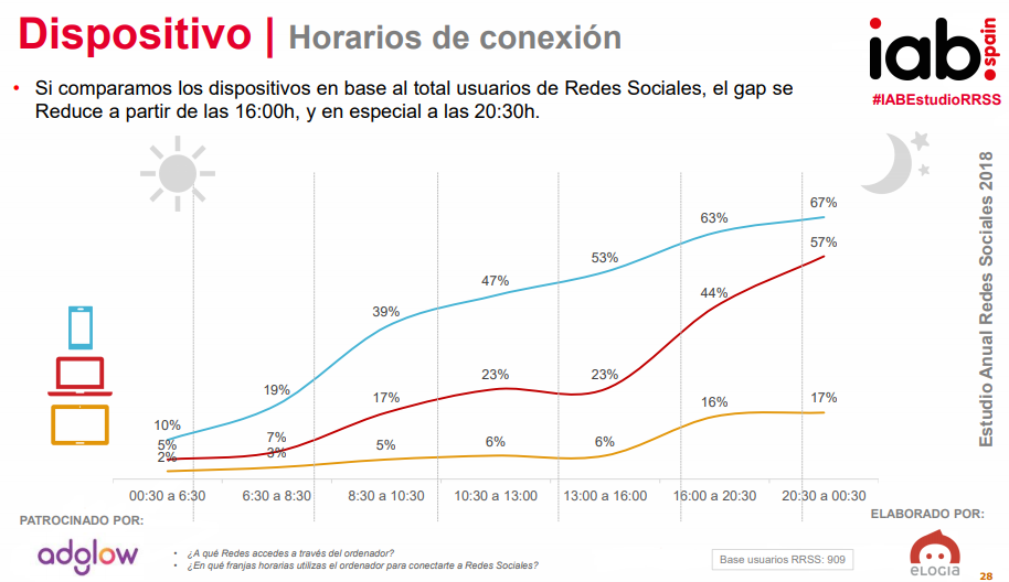 • Ordenador: El uso de Redes Sociales mediante este dispositivo se acentúa a partir de las 16:00, especialmente entre 20:30 y las 00:30.